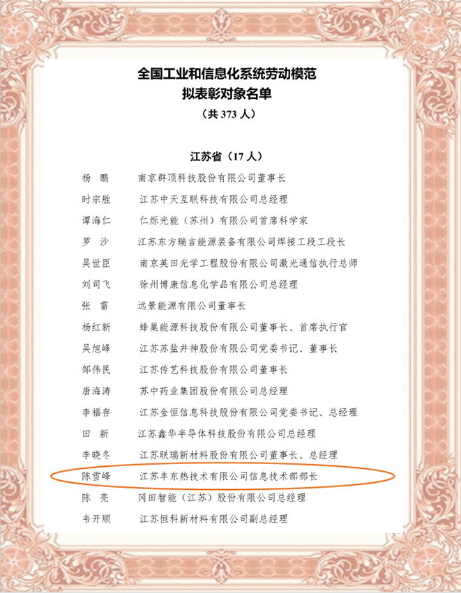 Recently, the Ministry of Industry and Information Technology of China announced the list of candidates for commendation of advanced collectives, labor models, and advanced workers in the national industrial and information system. Our company's Information Technology Department Director, Mr. Chen Xuefeng, was proudly listed as one of the awardees. He is one of the 17 industry models from Jiangsu Province and the only one from Yancheng to receive this honor. This national recognition not only deeply acknowledges Chen Xuefeng's twenty years of continuous innovation and perseverance, but also fully affirms our company's commitment to technological independence and self-reliance.