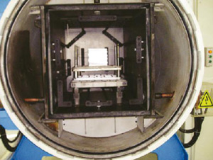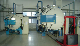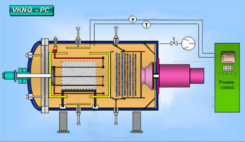 The vacuum heat treatment plant, type VKNQ is a simple, reliable and easy maintenance furnace with a horizontal, cubical zone. Heaters and heating insulation are made of graphite. The 12 heaters are equally arranged around the furnace wall which effectively ensures the uniformity of the temperature in furnace and easily to be replaced. The water-cooled current lead-throughs, made of copper, are mounted vacuum-tight and pressure tight into the vessel, which extend the copper electrode’s life and improved the reliability.