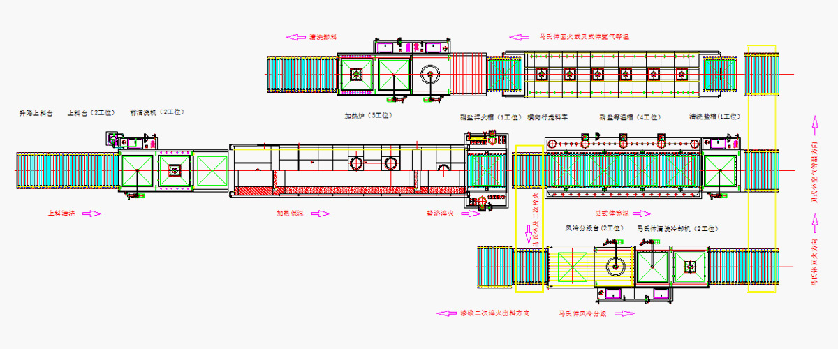 ◆Multi-purposes: The line can be used for various heat treatment, such as salt-bath bainite austempering, salt-bath martensite martempering, secondary quenching of carburized parts.
